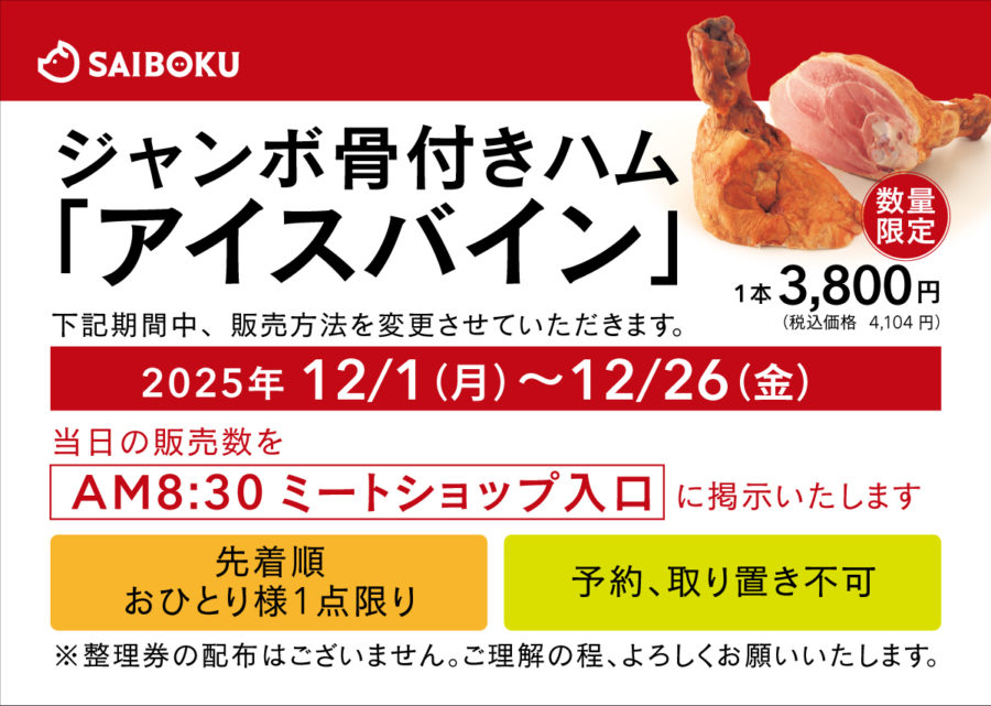 新着情報NEWS & MEDIA 園内情報 2025年11月28日 2025年12月1日(月)~12月26日(金)ジャンボ骨付きハム「アイスバイン」の販売についてのお知らせ 2025年12月1日(月)~12月26日(金)日高本店ミートショップでの、ジャンボ骨付きハム「アイスバイン」の販売についてのお知らせです。 詳しくは下記をご覧ください。 ※日高本店ミートショップ以外でのお取り扱いはございません。 前の記事 一覧を見る 次の記事