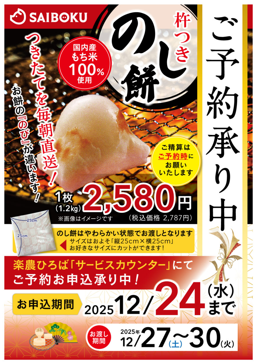 2025年11月6日(木)~2026年12月24日(水)「杵つき のし餅」のご予約を承ります。