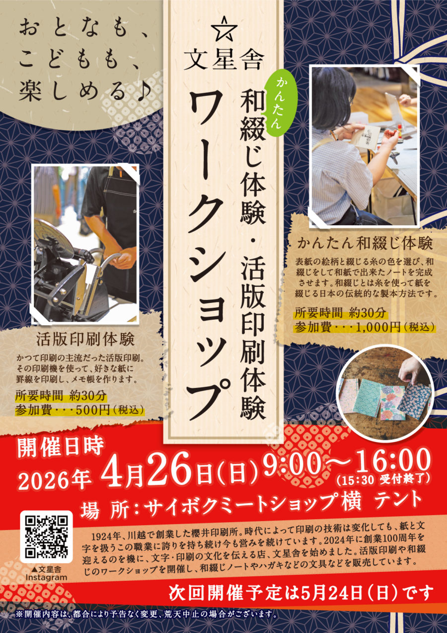 新着情報NEWS & MEDIA 園内情報 2026年4月10日 2026年4月26日(日)かんたん和綴じ体験・活版印刷体験ワークショップ 2026年4月26日(日)かんたん和綴じ体験・活版印刷体験ワークショップが出店いたします。 場所:ミートショップ横 テント 時間:9:00~16:00(15:30 受付終了) 紙と文字・印刷の文化をぜひご体験ください♪ 詳しくは下記、園内掲示のPOPをご覧ください。 出店予定:5月24日(日)時間:9:00~16:00(15:30 受付終了) ※開催の内容は予告なく変更、荒天(強風含む)中止になる場合がございます。 前の記事 一覧を見る 次の記事