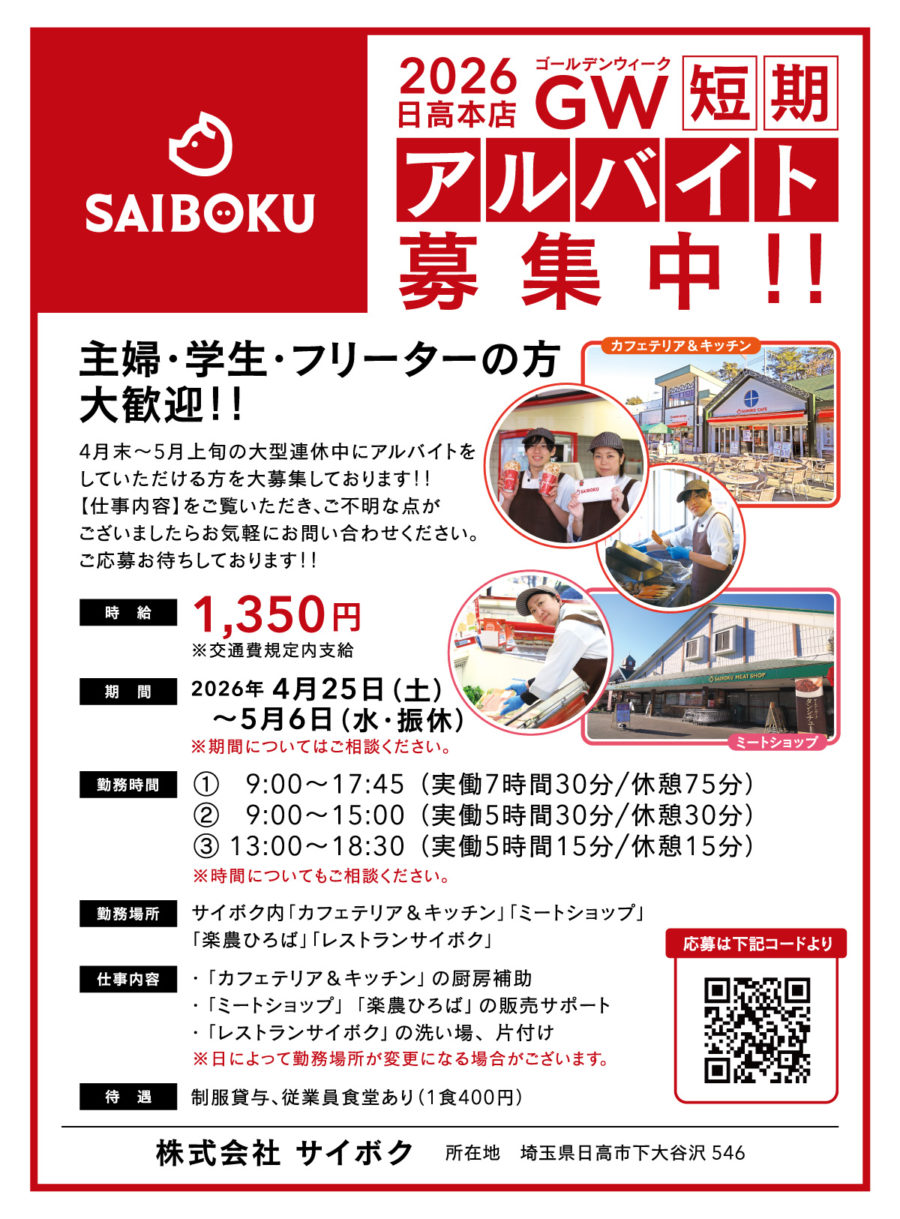 新着情報NEWS & MEDIA 園内情報 2026年3月25日 2026年GW短期アルバイト大募集! 只今、サイボクでは、GW短期アルバイト大募集しております! 詳しくは下記内容をご覧ください。皆さまのご応募、心よりお待ちしております! ■ ご応募は こちらから>> 前の記事 一覧を見る 次の記事