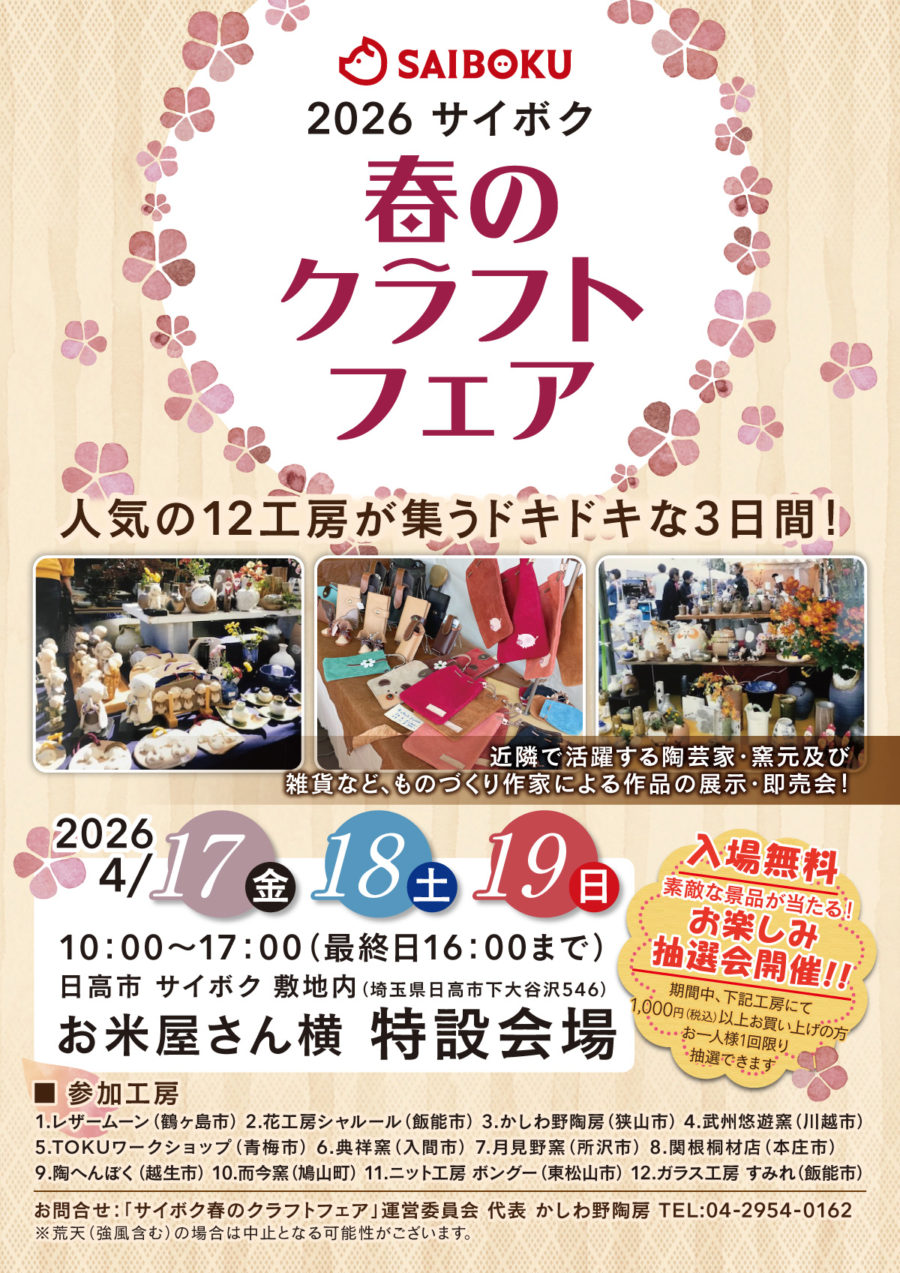 新着情報NEWS & MEDIA 園内情報 2026年2月18日 2026年4月17日(金)~19日(日)「サイボク 春のクラフトフェア」を開催いたします 2026年4月17日(金)~19日(日)「サイボク 春のクラフトフェア」を開催いたします これまでにサイボクの催事テントやイベントハウスに出店した 陶房やクラフト工房が一挙大集合します。 人気の12工房が集うドキドキな3日間! クラフトフェア期間中にはお楽しみ抽選会も開催! ご家族、お友達やお仲間などお誘い合わせのうえ、お気軽にご来場下さい。 前の記事 一覧を見る 次の記事