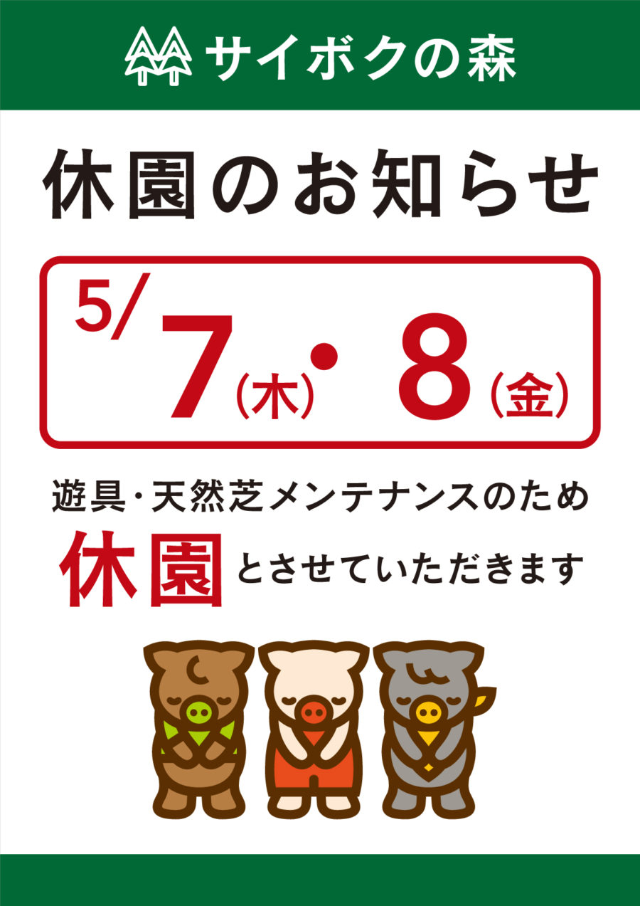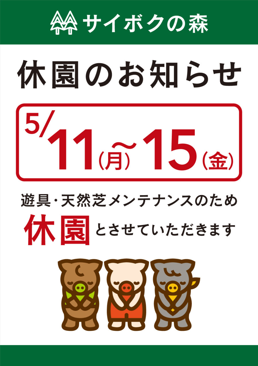 新着情報NEWS & MEDIA 園内情報 2026年4月10日 2026年5月7日(木)・8日(金)・11日(月)~15日(金)「サイボクの森」(有料アスレチック)は、遊具・天然芝メンテナンスのため休園とさせていただきます。 「サイボクの森」(有料アスレチック)は、遊具・天然芝メンテナンスのため以下の日程を休園とさせていただきます。 前の記事 一覧を見る 次の記事