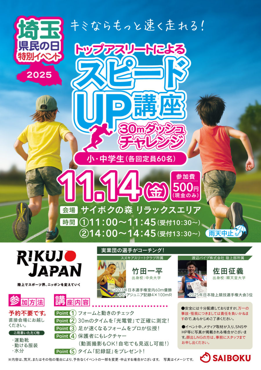 尚、当日サイボクの森にて、小・中学生向けの「トップアスリートによるスピードup講座~30mダッシュチャレンジ~」を開催いたします。(参加費:500円)