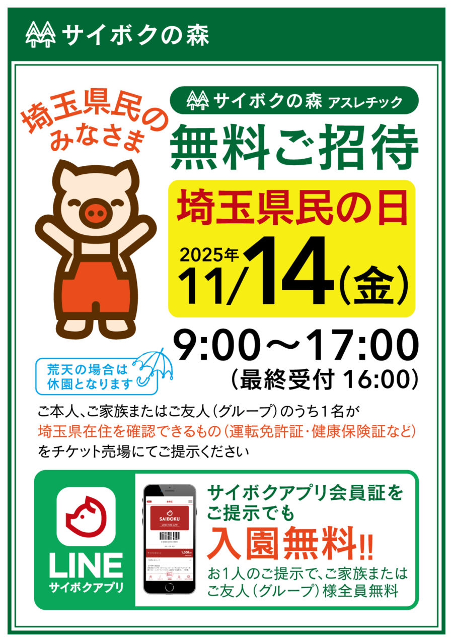 2025年11月14日(金)埼玉県民のみなさまを「サイボクの森」(有料アスレチック)に無料ご招待!