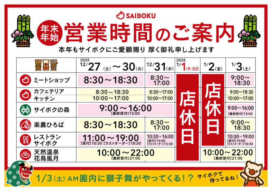 新着情報NEWS & MEDIA 園内情報 2025年12月1日 2025年12月27日(土)~2026年1月3日(土)営業時間・店休日のお知らせ 2025年12月27日(土)~2026年1月3日(土)営業時間・店休日のお知らせです。 一覧を見る 次の記事