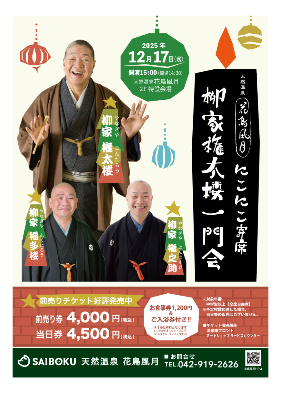 2025年12月17日(水)天然温泉 花鳥風月 にこにこ寄席 「柳家権太楼一門会」開催いたします。