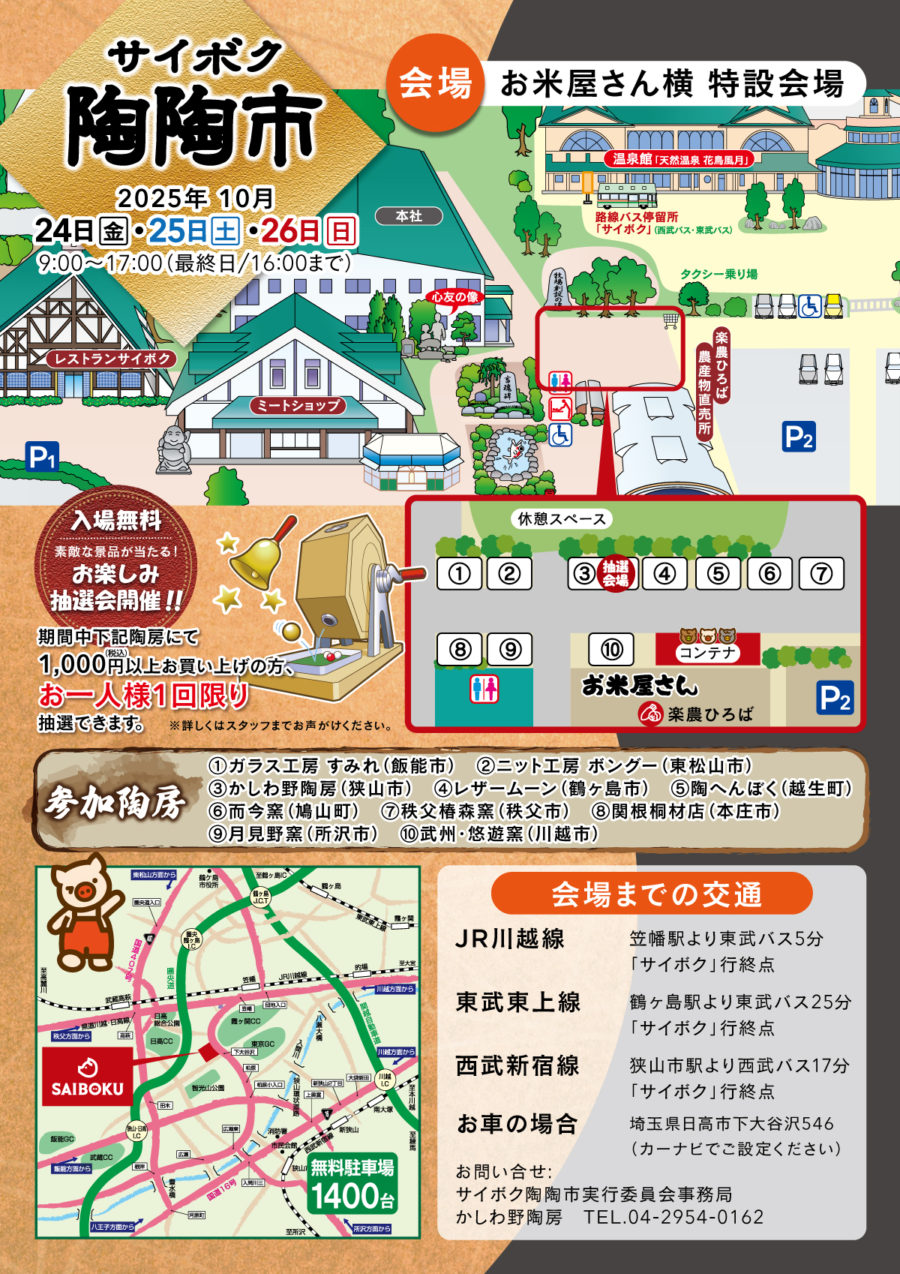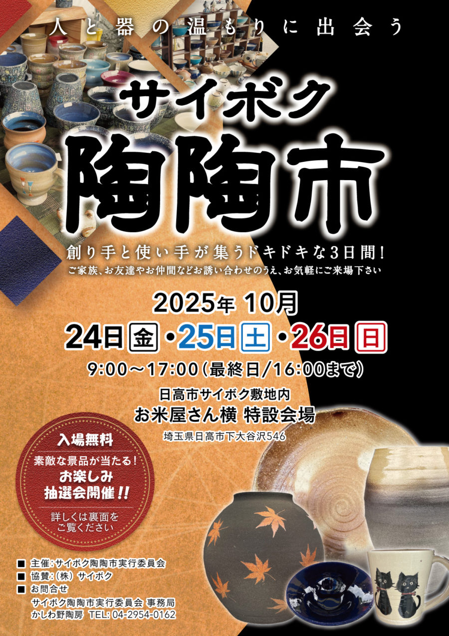 花鳥風月のお知らせ イベント 2025年9月23日 2025年10月24日(金)~26日(日)「サイボク陶陶市」を開催いたします 2025年10月24日(金)~26日(日)「サイボク陶陶市」を開催いたします 創り手と使い手が集うドキドキな3日間! ご家族、お友達やお仲間などお誘い合わせのうえ、お気軽にご来場下さい。 前の記事 一覧を見る 次の記事