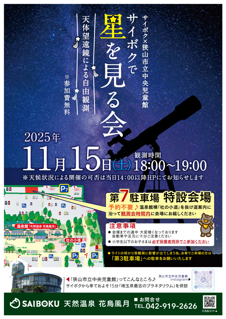 花鳥風月のお知らせ イベント 2025年10月18日 2025年11月15日(土)「サイボクで星を見る会」を開催いたします 2025年11月15日(土)「サイボクで星を見る会」を開催いたします ※雨天中止(開催予備日はございません) ※天候状況による開催の可否は当日14:00以降HPにてお知らせします。 予約不要!参加費無料!自由観測となっております。観測会時間内に会場にお越しください。 時間:18:00~19:00 会場:第7駐車場特設会場 みなさまのご参加、スタッフ一同心よりおまちしております。 ※詳細はポスターをご覧ください。 前の記事 一覧を見る 次の記事