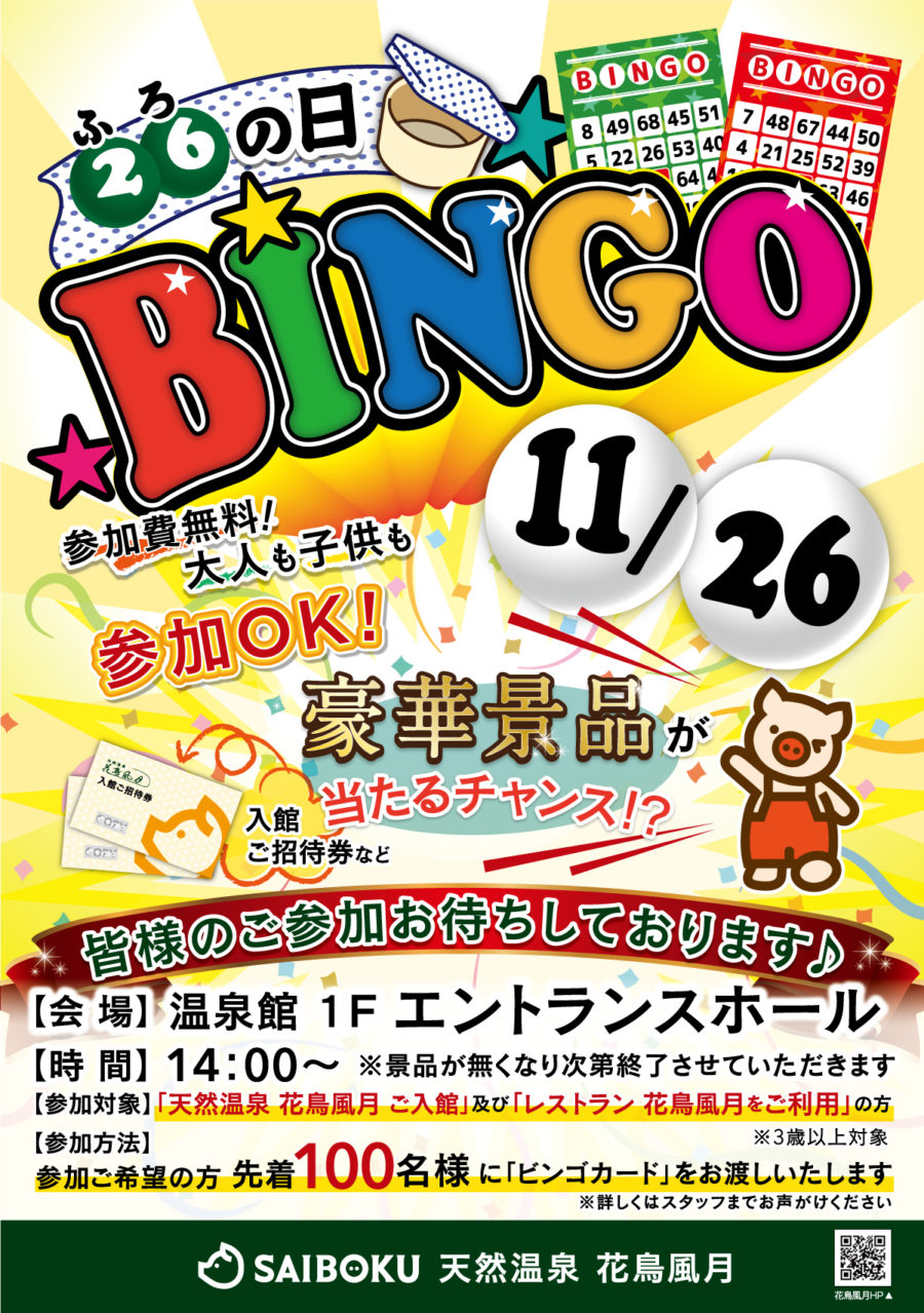 花鳥風月のお知らせ イベント 2025年11月10日 2025年11月26日(水)26(ふろ)の日BINGO大会を開催いたします 2025年11月26日(水)26(ふろ)の日BINGO大会を開催いたします。 大人も子供も参加OK! 入館ご招待券など、豪華景品が当たるチャンス!? 皆様のご参加お待ちしております。 詳しくは下記、または館内掲示のポスターをご覧ください。 ご不明な点はスタッフまでお声がけください。 一覧を見る 次の記事