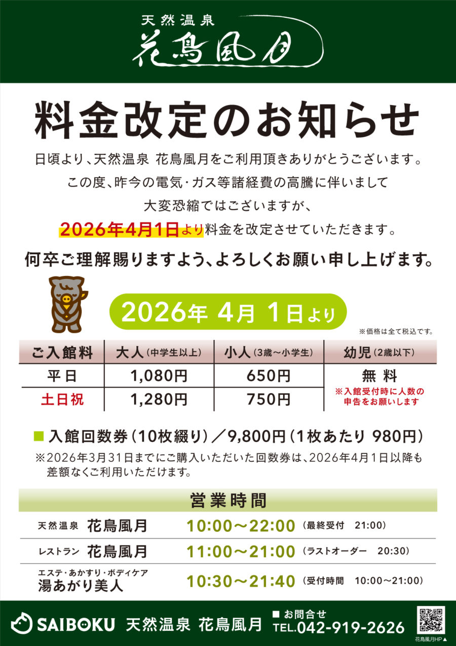 2026年4月1日より 温泉館 花鳥風月の入館料金を改定させていただきます