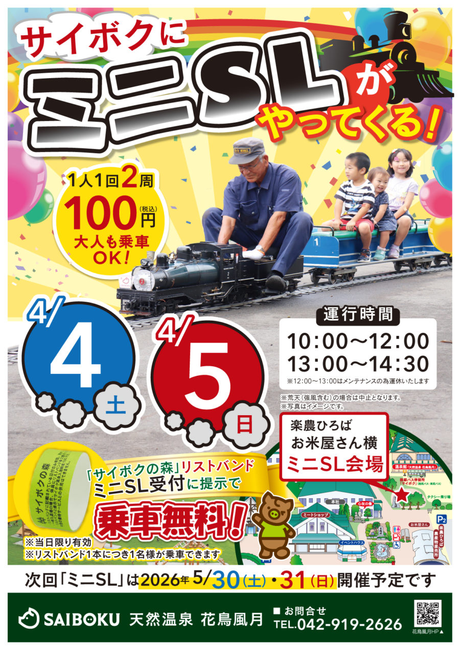 花鳥風月のお知らせ イベント 2026年2月18日 2026年4月4日(土)・5日(日)サイボクにミニSLがやってくる! 2026年4月4日(土)・5日(日)サイボクにミニSLがやってくる! 会場は楽農ひろばお米屋さん横、ミニSL会場です。 なんと!大人も乗車できちゃいます! 当日、サイボクの森アスレチック(有料エリア)のリストバンドを ミニSL受付で提示すると「リストバンド1本」につき「1名様」乗車無料! もちろん、ひとり1回100円(税込)でも乗車できます! 是非 ご家族の思い出にいかがでしょうか! 皆様のご来場心よりお待ちしております。 ※開催内容の詳細についてはポスターをご覧ください。 前の記事 一覧を見る